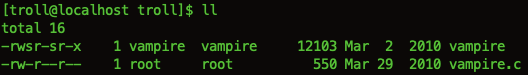 core 파일을 생성하려면 자신의 권한에서 segmentation fault가 발생해야 하기 때문에 vampire 파일을 vampire2 파일로 복사한 후