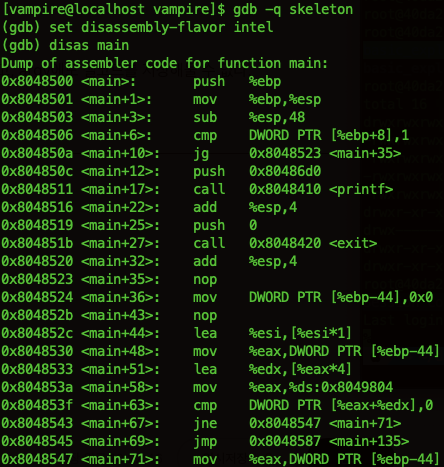 심볼릭 링크 파일로 skeleton2를 실행하면 core 파일이 생성되고, 스택 마지막 쪽(큰 주소 쪽)을 보면 셸코드 형태인 프로그램 이름 자체가 들어가 있는데 이 주소는 0xbfffff65이다.