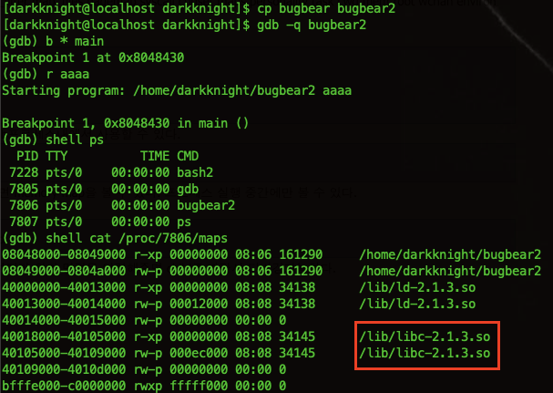 bugbear 파일을 bugbear2 파일로 복사한 후 gdb로 연 뒤 bp를 걸고 인자를 대충 적어서 실행한 후 메모리맵을 보면 libc-2.1.3.so를 사용 중인 것을 확인할 수 있다.