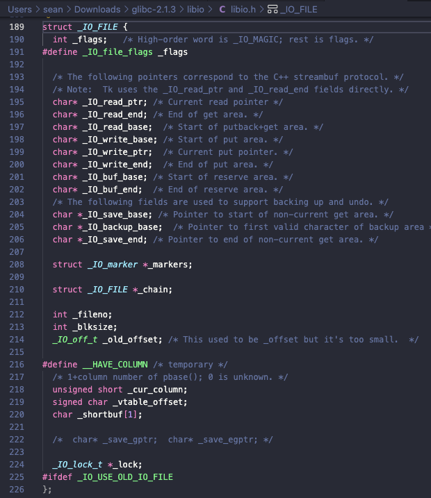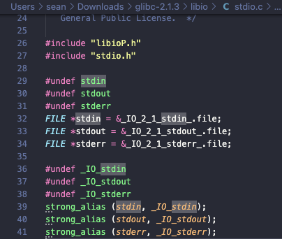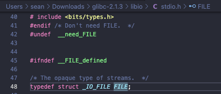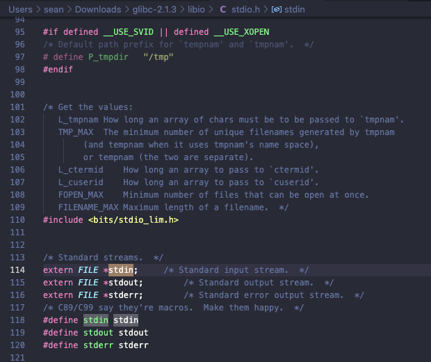 glibc-2.1.3에서 stdin은 "_IO_FILE"이라는 구조체의 구조체 포인터 형식으로 선언되어있다.