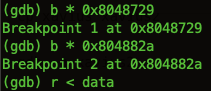 그리고 fgets() 함수를 호출하는 부분 0x8048729와 ret 명령 부분 0x804882a에 breakpoint를 걸고 test payload를 입력으로 주며 실행한다.