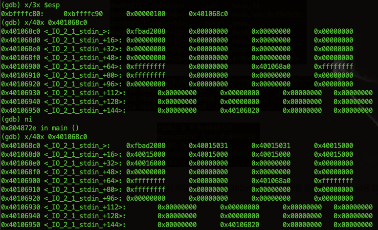 참고) x/40x 0x401068c0 대신 x/40x stdin을 입력해도 된다.