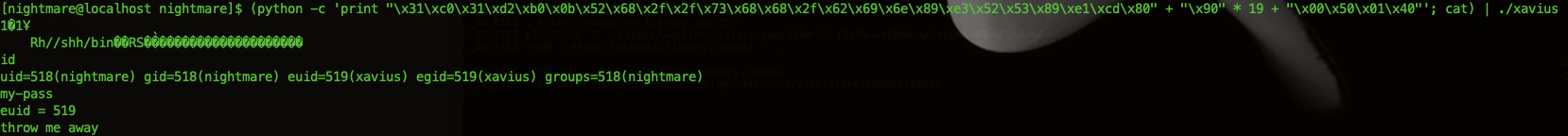 payload를 수정하여 xavius에 인자로 주며 실행하면 xavius의 password인 throw me away를 얻을 수 있다.