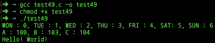 위 예제는 두 가지 열거형 자료형을 정의한 뒤에 사용하는 예를 보여주고 있다.
