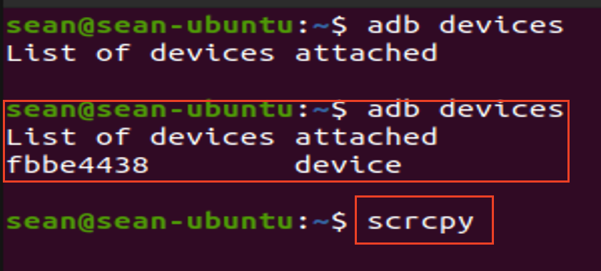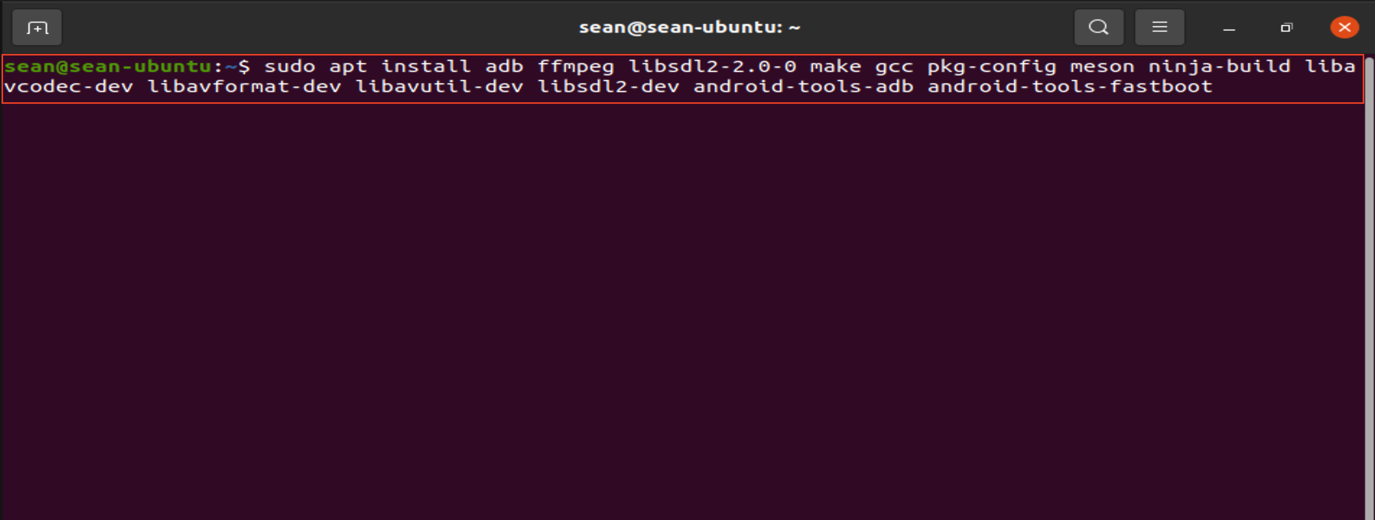 sudo apt install adb ffmpeg libsdl2-2.0-0 make gcc pkg-config meson ninja-build libavcodec-dev libavformat-dev libavutil-dev libsdl2-dev android-tools-adb android-tools-fastboot