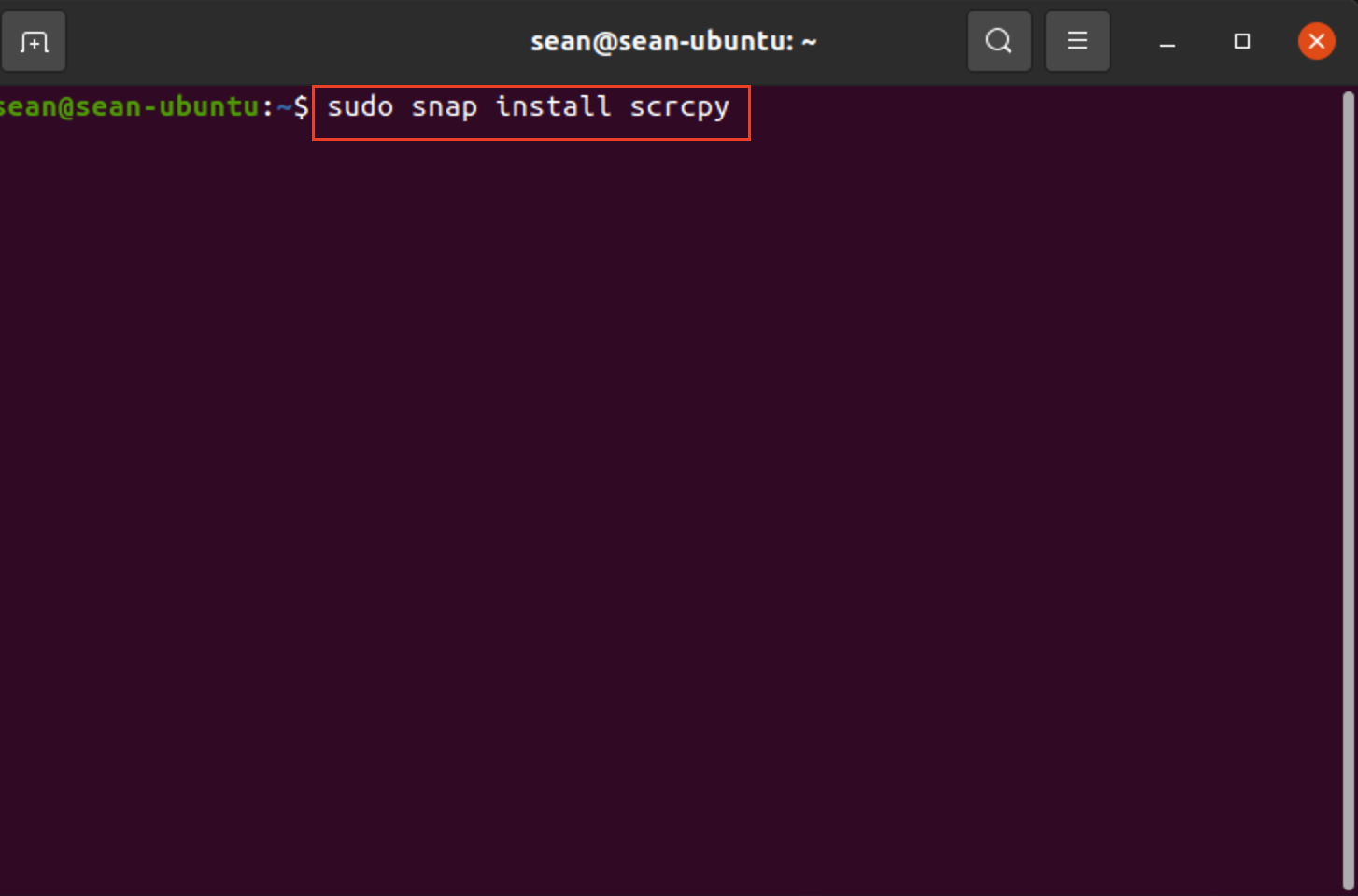 먼저, sudo snap install scrcpy를 입력하여 scrcpy를 설치해줍니다.