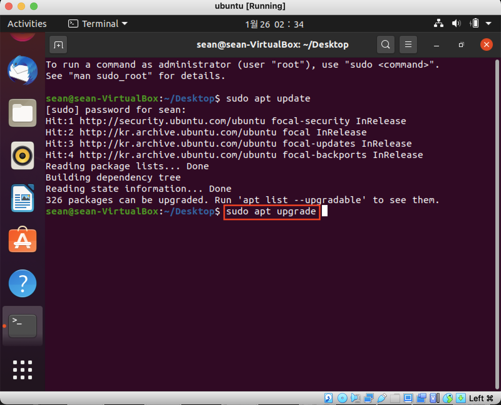 다음으로 sudo apt upgrade를 입력하여 패키지들을 최신 버전으로 업그레이드 해줍니다.