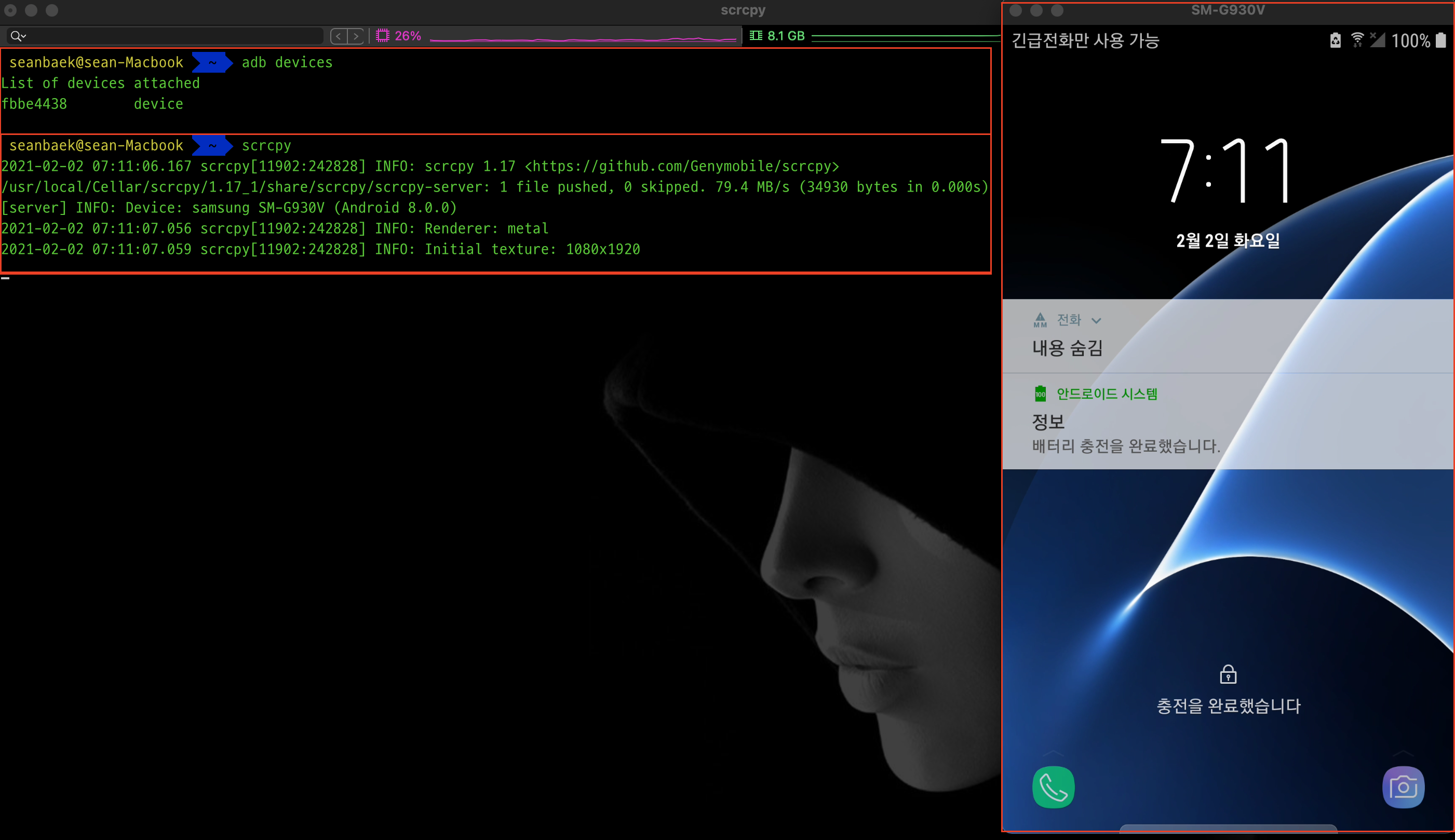 이렇게 해서 안드로이드 스마트폰의 화면을 Kali Linux에서 미러링을 해보았습니다.