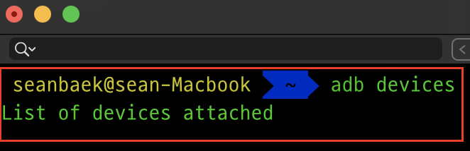 그다음 MacOS 내에 있는 Terminal에서 아래의 사진과 같이 adb devices를 입력해줍니다.