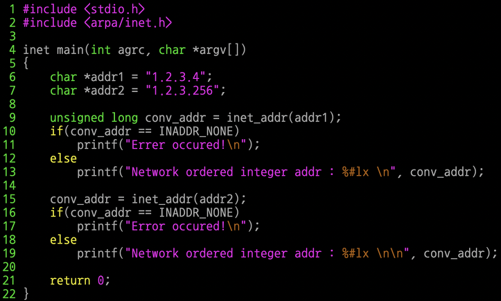 이 잘못된 주소를 이용해서 inet_addr 함수의 오류 검출능력을 15번째 줄에서 확인한다.